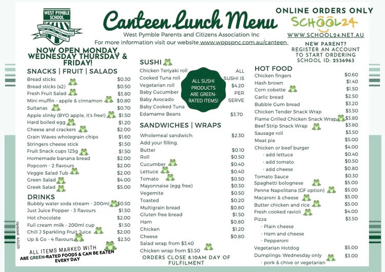 We are extremely fortunate to have a dedicated canteen team that is run by the P&C open for lunch and recess on Mondays, Wednesdays, Thursdays and Fridays.
