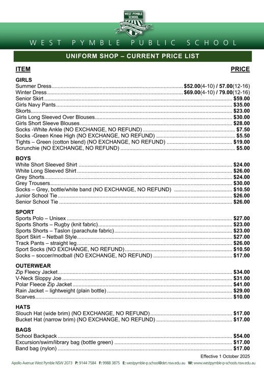 Any uniform shop enquires can be made direct to Excel Uniforms by phoning 0405 506 383 or emailing wpps@exceluniforms.com.au